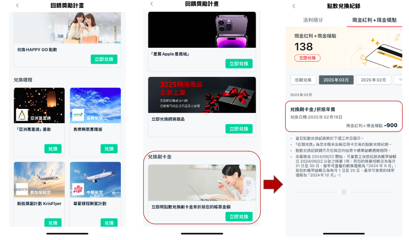 那刷卡回饋的1.2%回饋的點數,可以做何使用?星展回饋獎勵計畫裡,包含可以到星展APPLE星商城兌換蘋果商品、精選商品兌換、兌換HAPPY GO點數、兌換哩程、兌換刷卡金...等,我最常使用的就是兌換刷卡金,不過要注意的是:刷卡金須以300的點數倍數做折抵,舉例你有1000點數,單次最多也只能折抵900元刷卡金。